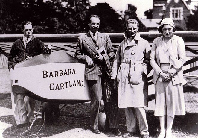 By the 1920’s Barbara Cartland was earning a good living as a society journalist and subsequently also a romantic novelist. She was attending the society events at places like Brooklands Motor Course. She persuaded the Brooklands authorities to set aside a reading room for ladies. When you come to visit the Brooklands Museum, you will signs in the Clubhouse to the Barbara Cartland Room. Here you will find a replica of the Ladies’ Reading Room, some artefacts owned by, or related to, Barbara Cartland and a photograph of a glider carrying her name.